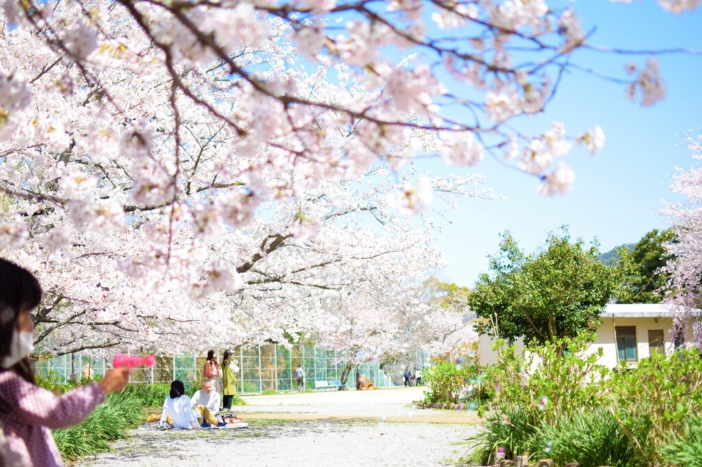 3月末の風頭公園では、広い敷地で花見が楽しめます。